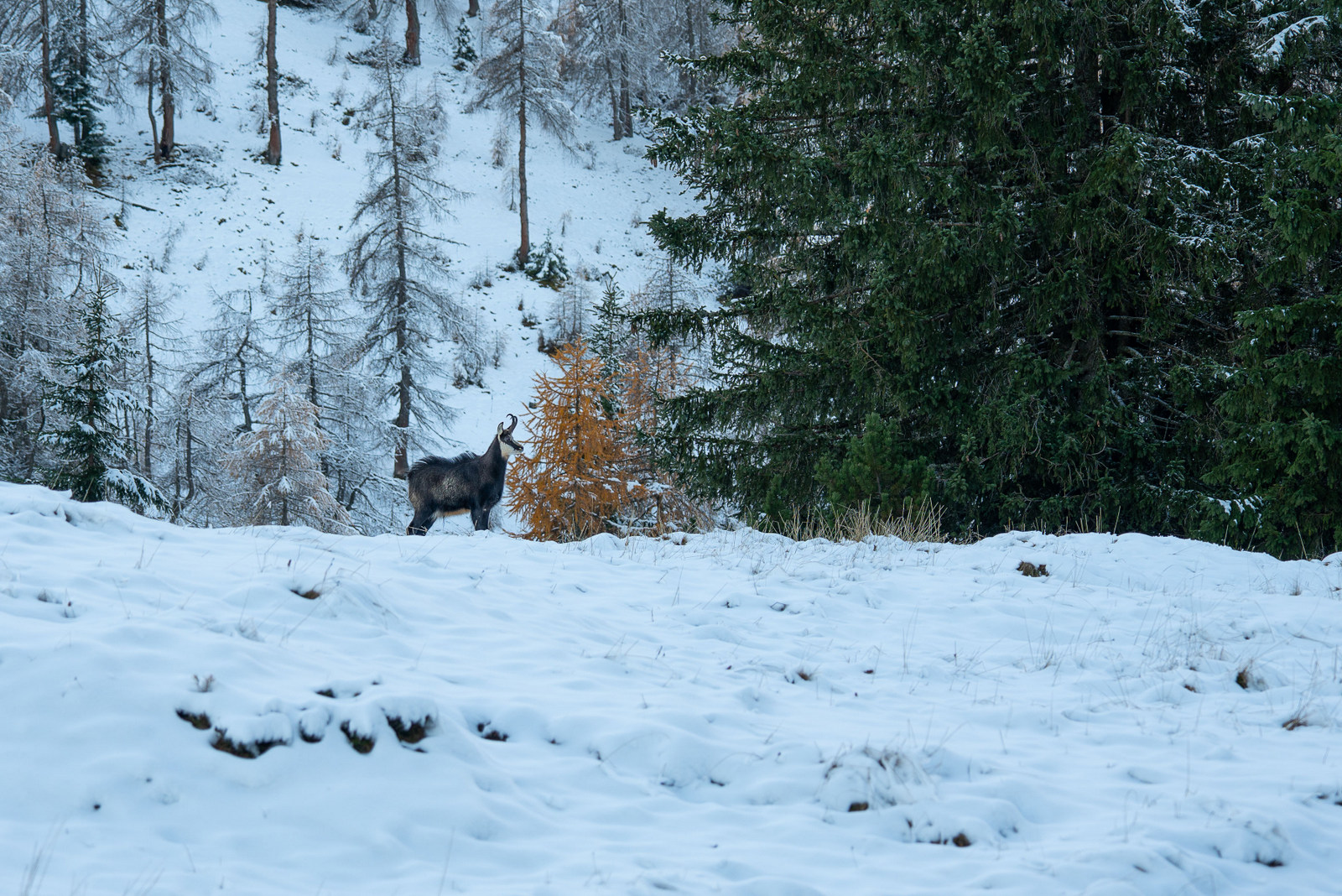 Nach 100 m Fahrt geraten die Gamsen in Panik und stürmen in wildem Tempo quer über den Forstweg. Aber nicht genug, es kommen immer Gemsen aus dem Wald, um den Vorgestürmten ohne Rücksicht auf Verluste zu folgen. In der Sorge überrannt zu werden, halte ich lieber an. Aber der Strom der Flüchtenden reisst nicht ab und so starte ich wieder, in der Hoffnung, nicht gerammt zu werden. Tatsächlich bleiben die letzten Gemsen dann doch stehen.