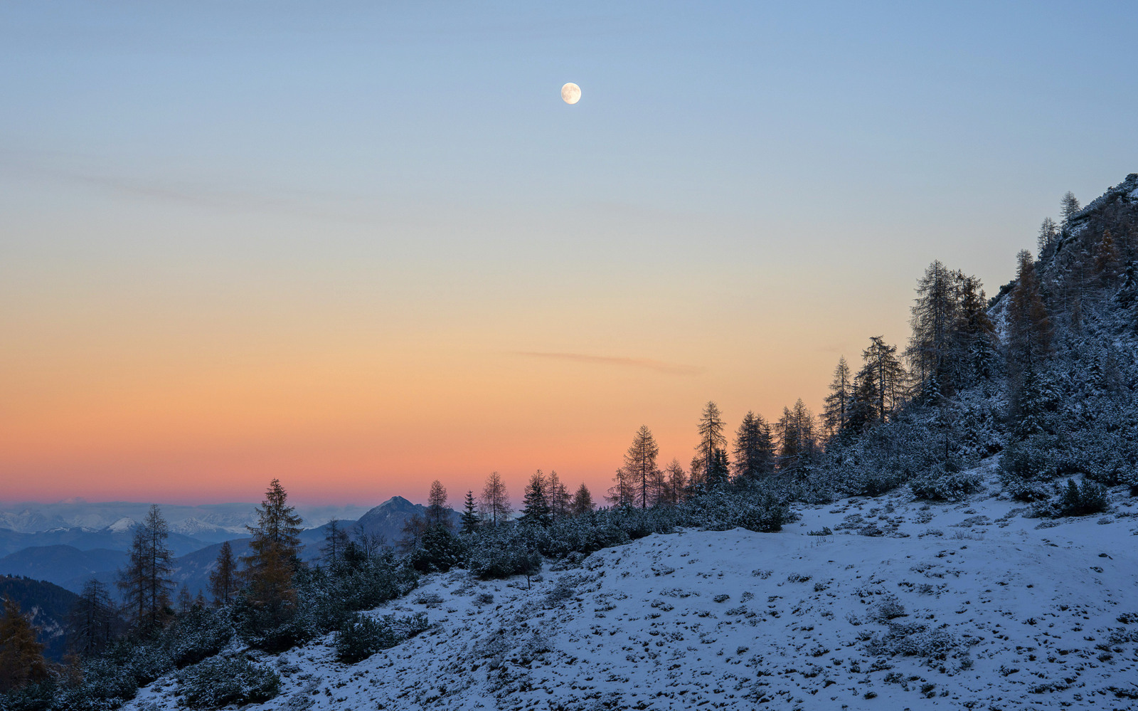 Die tiefstehende Sonne zeigt allerdings auch an, dass sie nur noch wenige Minuten ihr Licht über den Bergkamm senden wird. Aufgrund der Bedinungen war es wohl klüger, den Gipfel nicht mehr in Angriff zu nehmen. Bei Dunkelheit den steilen Steig wieder abzusteigen, war keine verlockende Vorstellung.